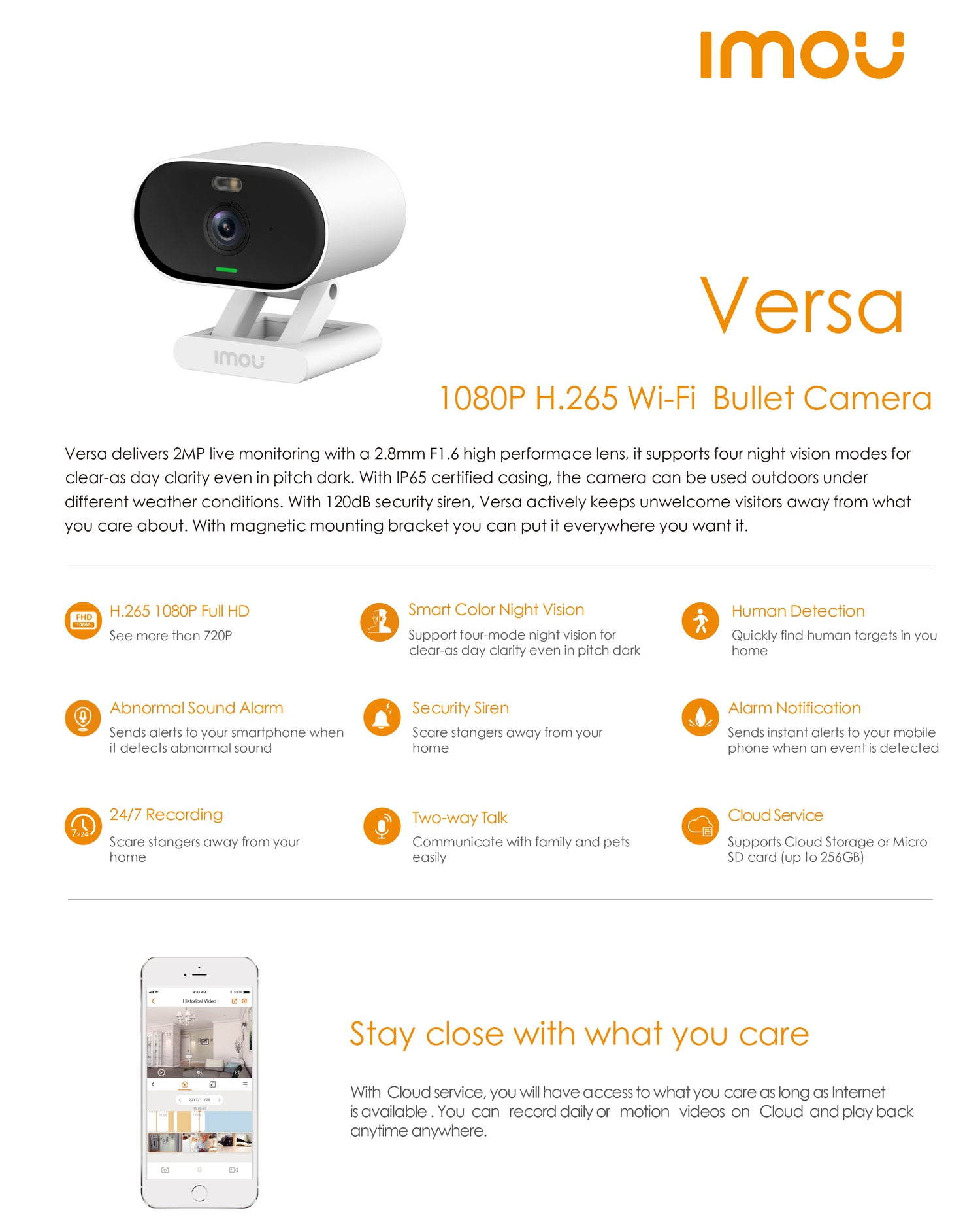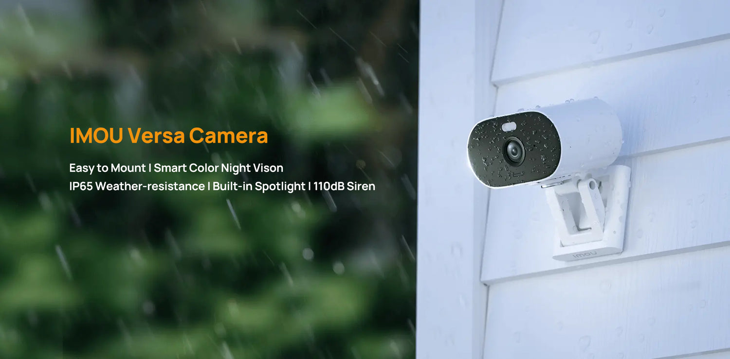 IMOU Versa is an all in one security solution that includes an integrated spotlight, 100dB siren and a camera which records HD 1080p resolution recording. The camera includes enhanced AI technology which prevents false recordings by recognising humans, vehicles and animals. View coloured video, even at night, with coloured LED night vision up to 20m and record locally to the camera via an SD card (max 256GB). The camera also includes a mic a speaker so that you can hear and talk back to the cameras location.